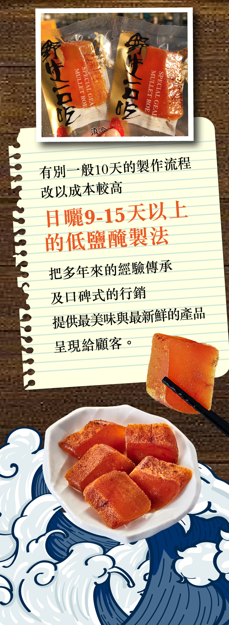● 精選烏魚,採用薄鹽醃漬