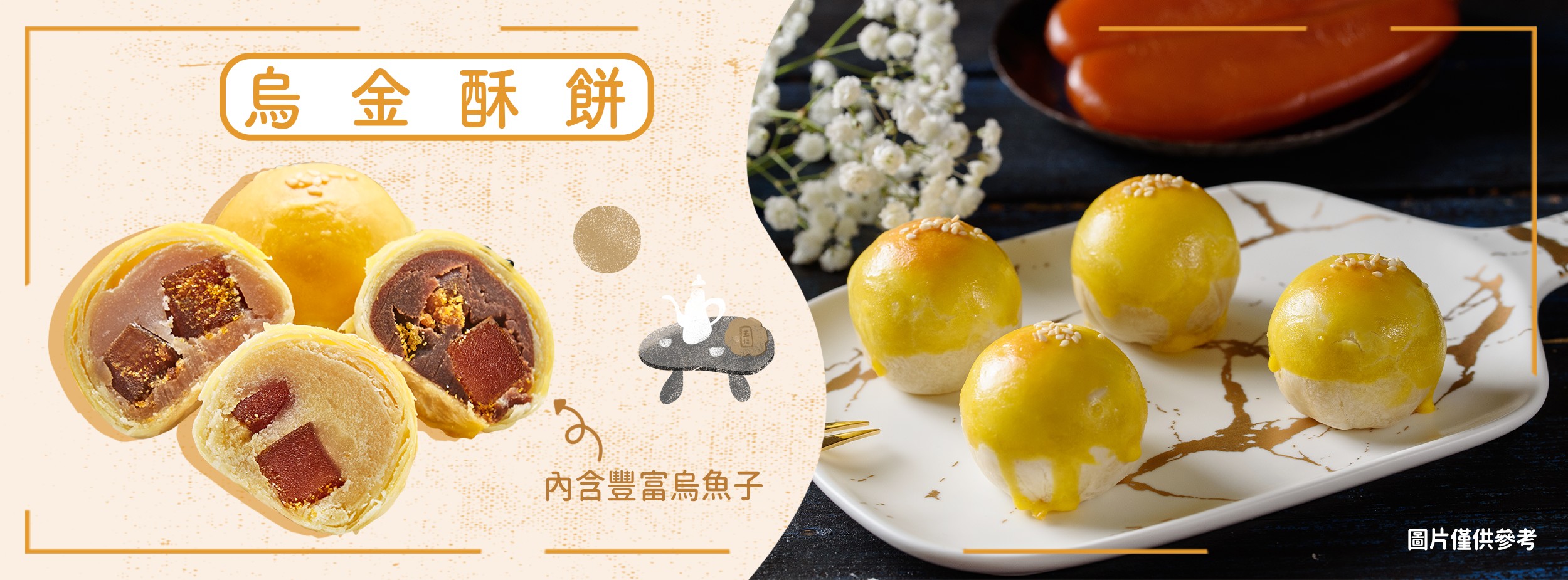 推出的限量版烏金嚴選野生烏魚子取代傳統鴨蛋將它融入月餅中,不可錯過的烏金酥餅禮盒,內含豆沙、綠豆、芋頭三種口味各三顆。讓人清爽又無負擔。趁著年節好日,丸群號推出的應景「好香聚禮盒」使用「烏金」之稱野生烏魚子滿滿海味隱藏於月餅中結合甜而不膩綠豆沙,烏豆沙,芋頭三種口味